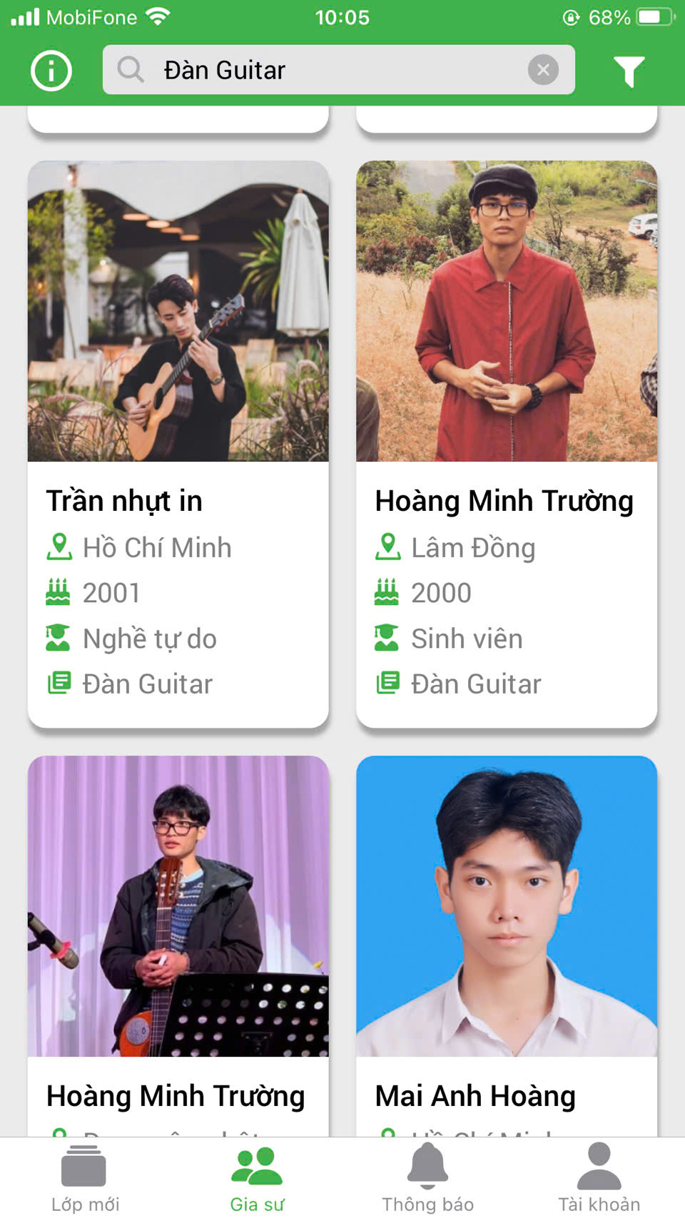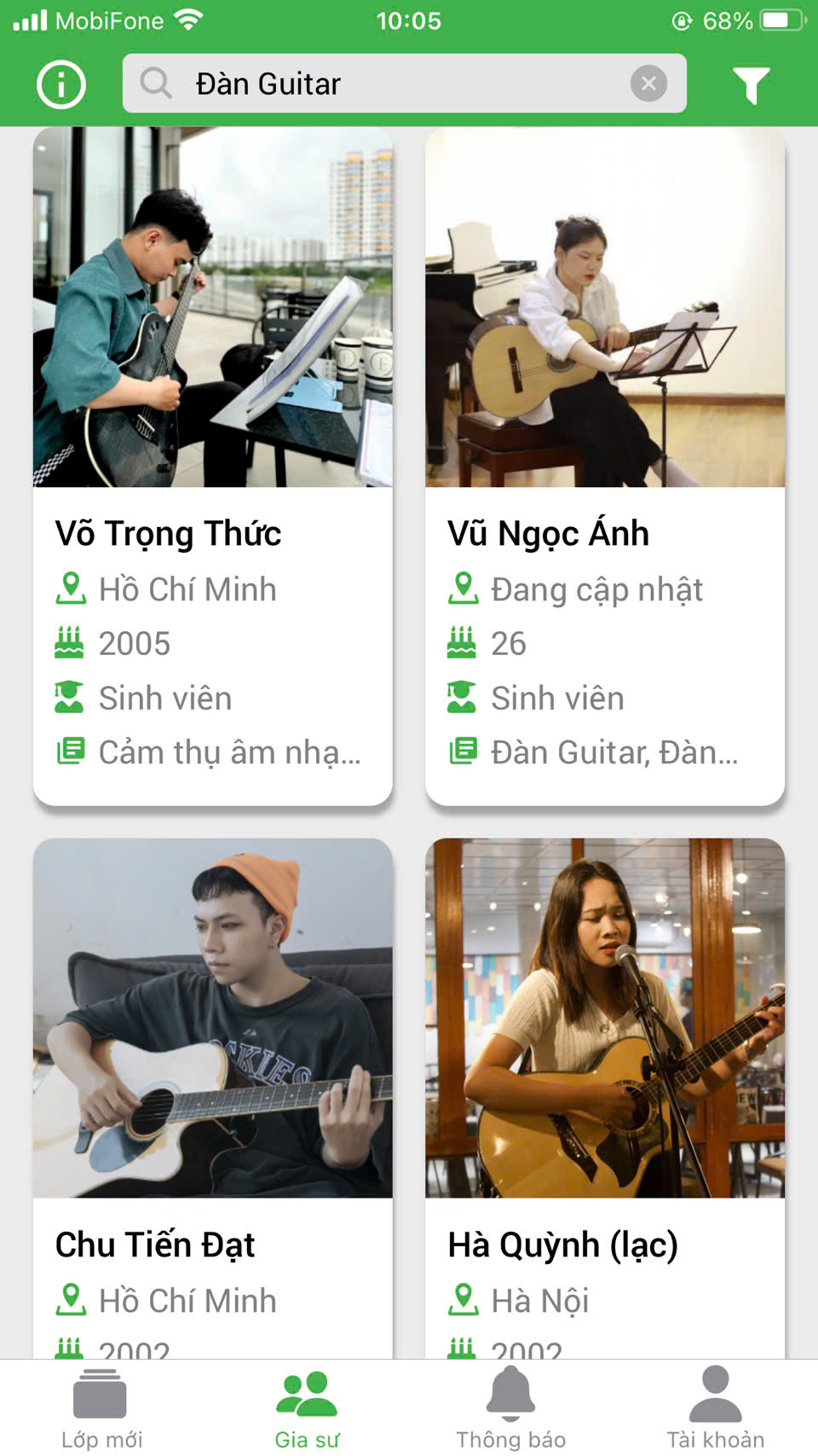 - Thầy cô giáo viên, gia sư Guitar có kiến thức âm nhạc từ việc học chính quy chuyên ngành Sư phạm Âm nhạc, thanh nhạc tại Đại học Sài Gòn, Nhạc viện TPHCM, Cao đẳng sư phạm Trung Ương,...